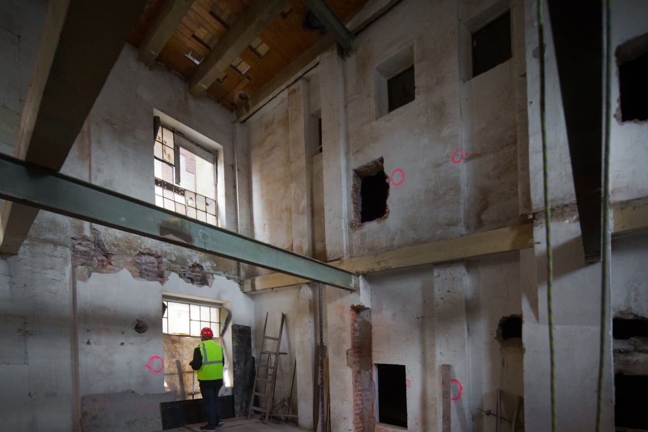 „Začalo se tím, že pracovníci dodavatelských firem museli šetrně demontovat zachované prvky mlynářské technologie, například shozy na mouku, vysévací stroj, korečkové elevátory, části stabilního hasicího zařízení, motor transmise a další. Byla pořízena přesná dokumentace tak, abychom na konci stavby mohli vybrané prvky opět namontovat jako stálé exponáty budoucí galerie, “ popsal začátky stavby architekt Petr Všetečka.